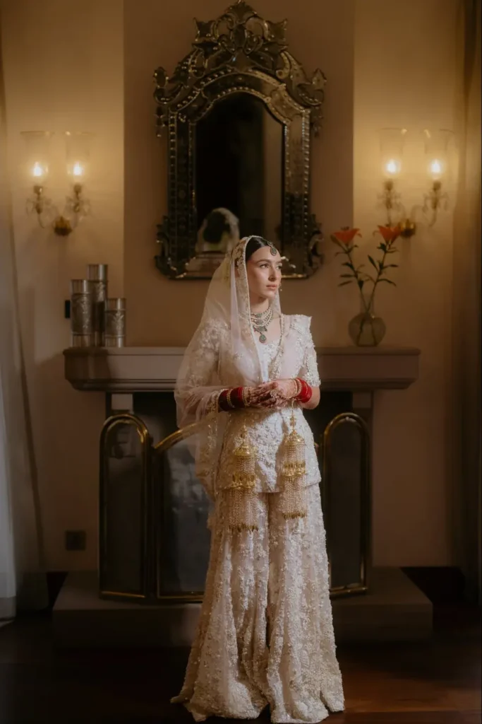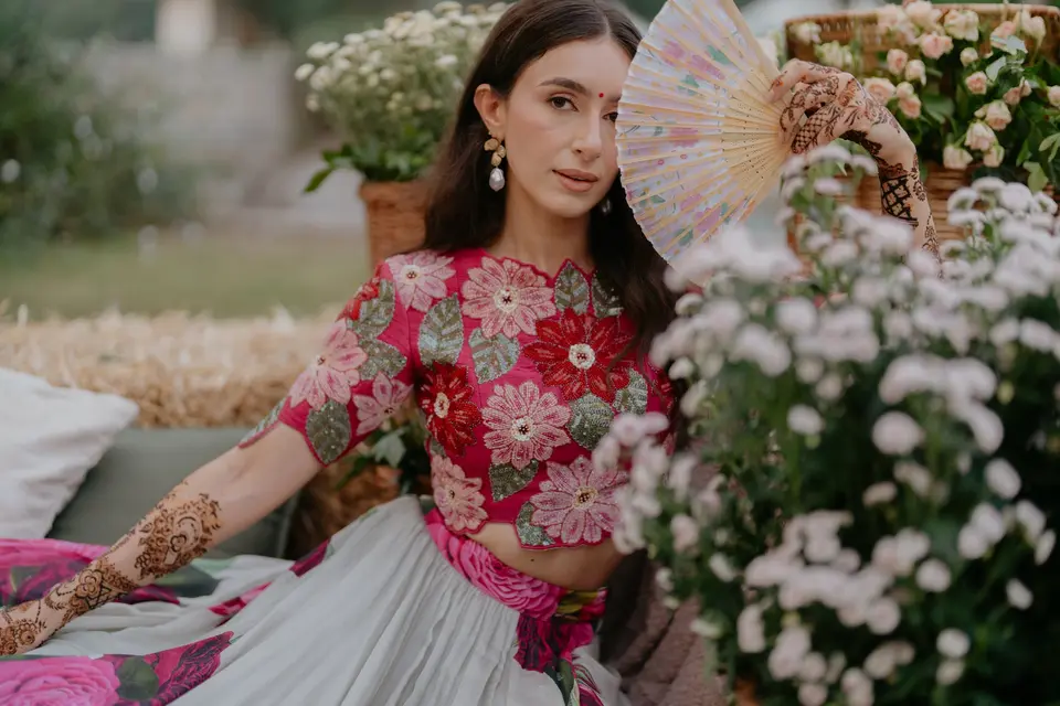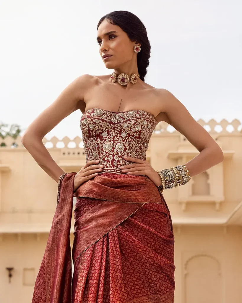 The corset blouse is making a stunning comeback in Indian fashion. Thanks to Gen Z’s love for statement fits, waist-focused silhouettes, and nostalgic fashion with a twist. Brides can pair corset blouses with saris, lehengas, and even sharara dresses, experimenting with fabrics like sheer organza, embroidered tulle, and metallic silks.